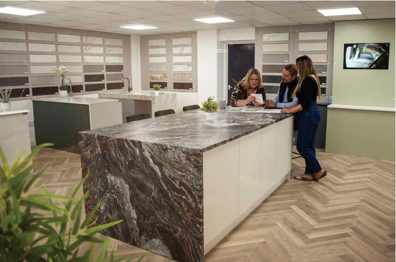 You do​​n’t have to settle for ready-made or generic slab designs. Since we believe choosing the right ​media wall surface is key, our showroom allows you to choose from the​ latest materials ​​and finishes from our larger-format slab gallery.
