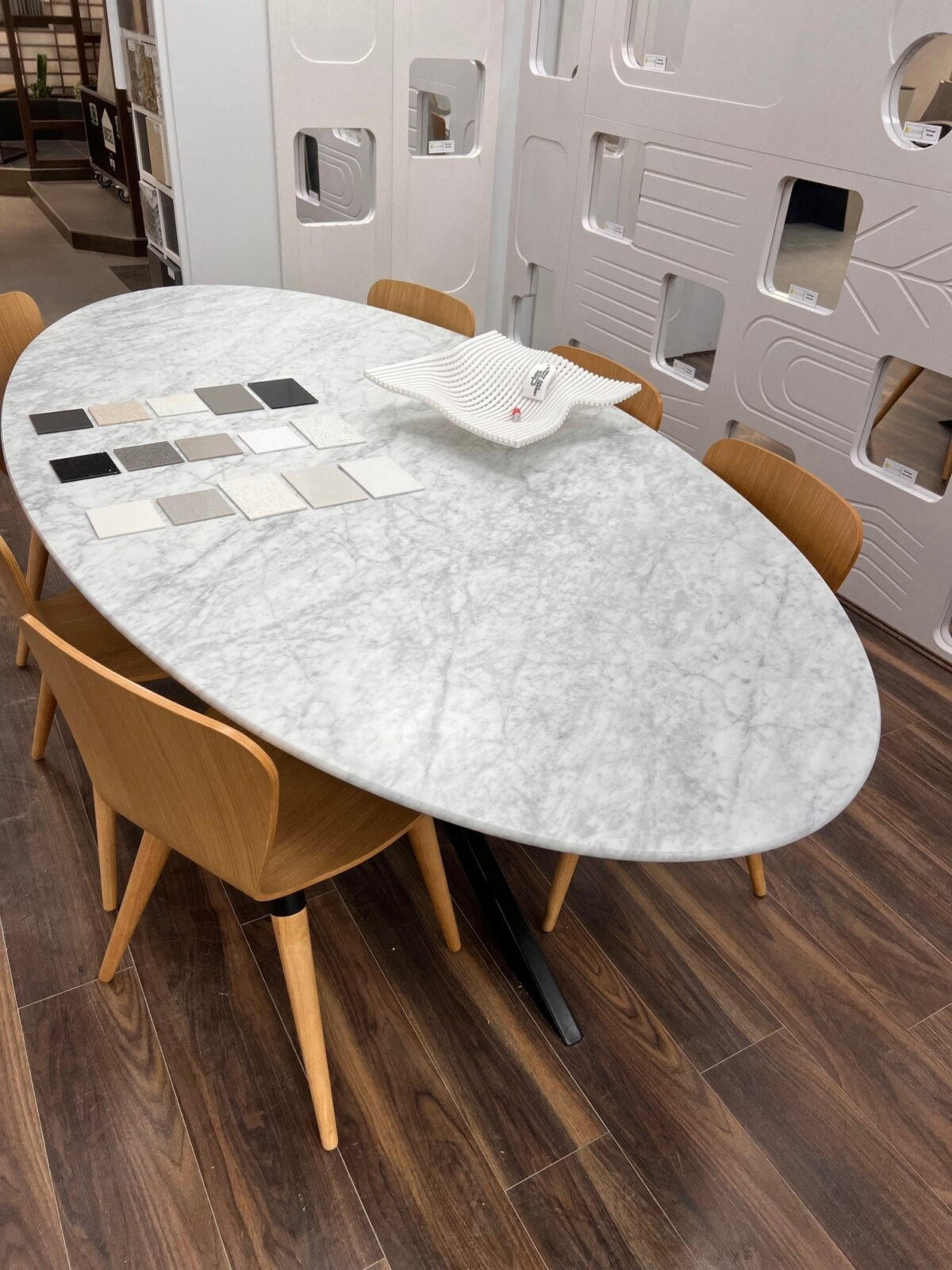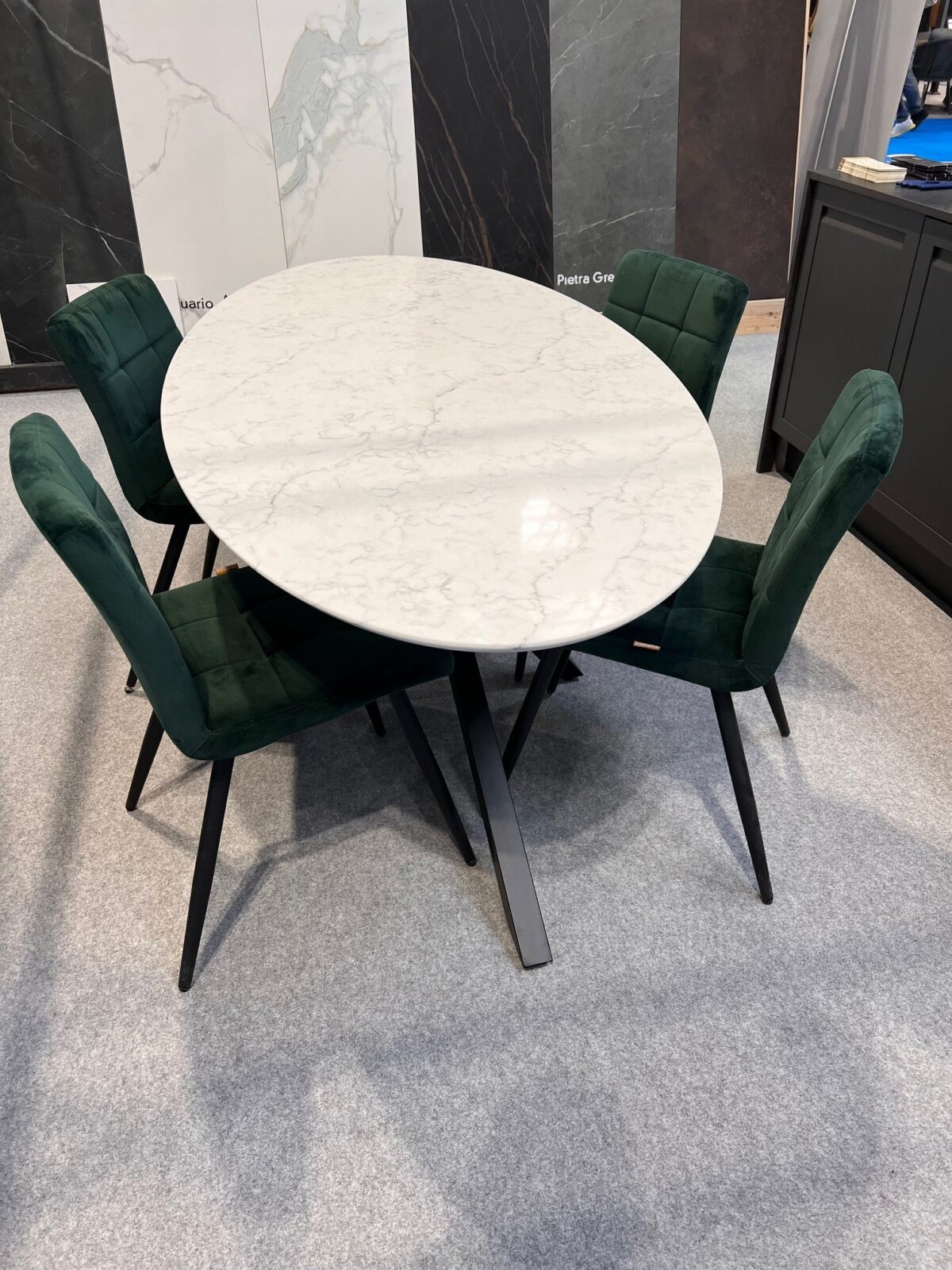 Oval dining table with polished stone top.