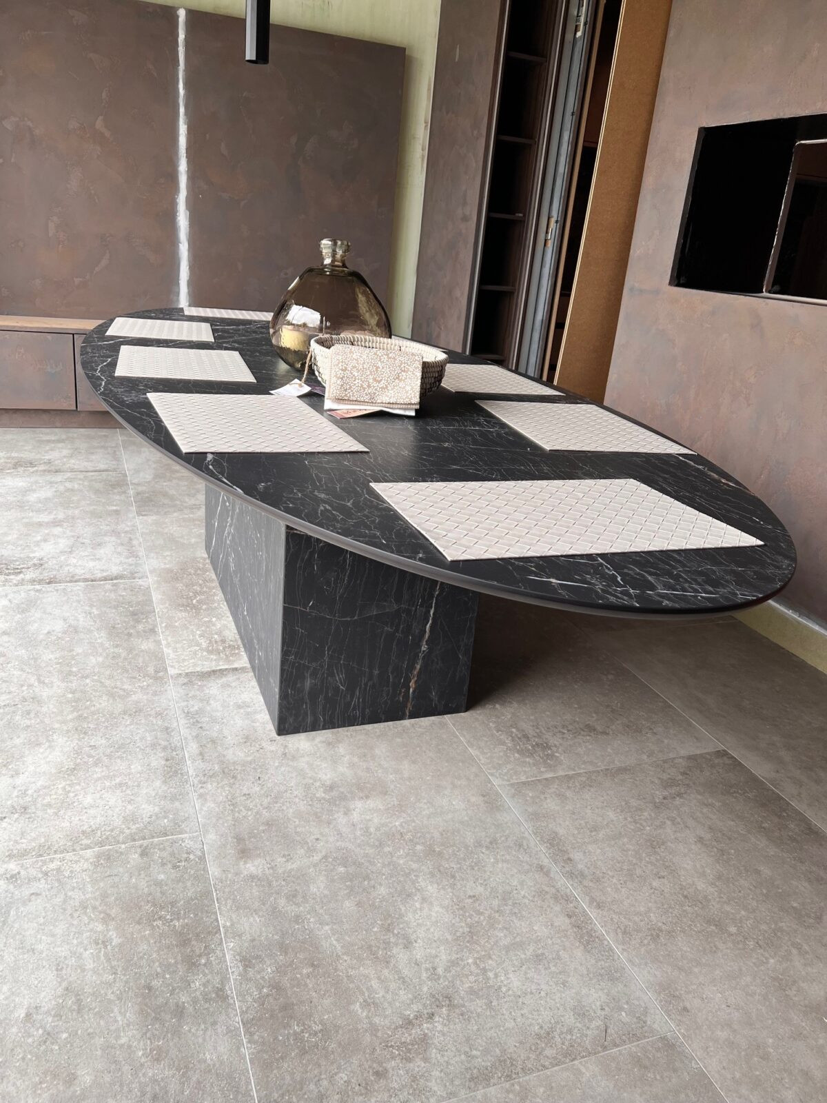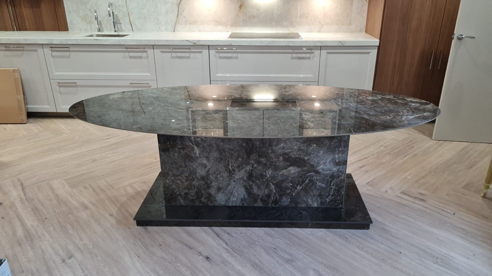 Oval dining table with polished stone top