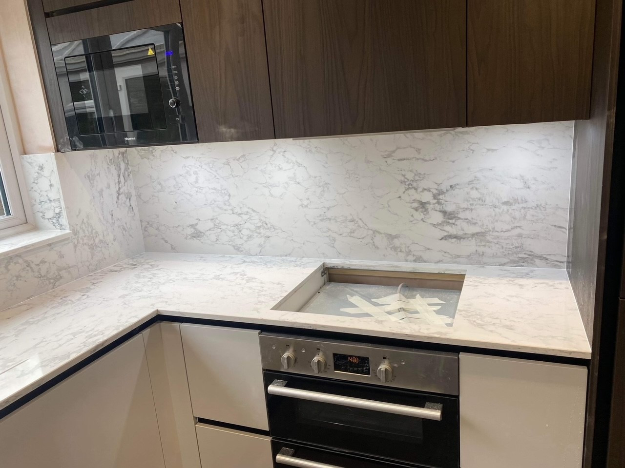 Classic white quartz with swirling grey veining, offering a timeless marble aesthetic.