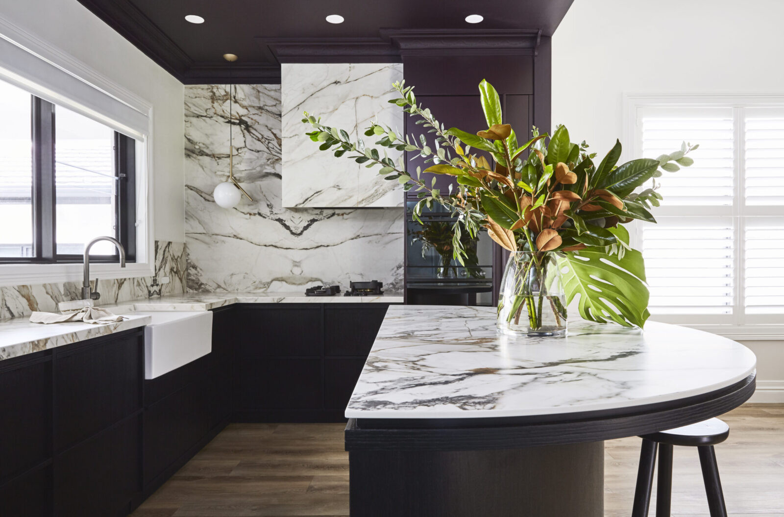 Bright and polished surface with dramatic grey streaks over a soft opalescent base refined and striking.