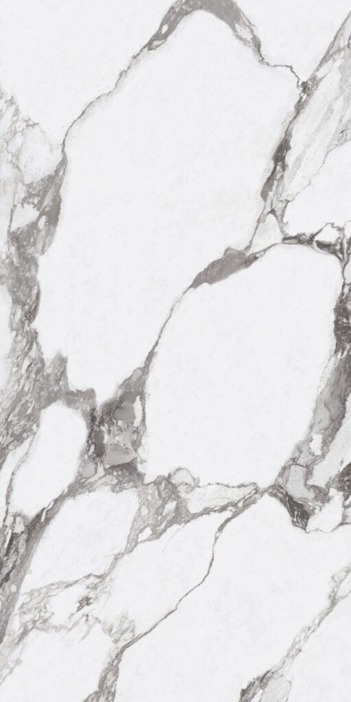 Glossy marble-look surface with flowing dramatic grey veining.