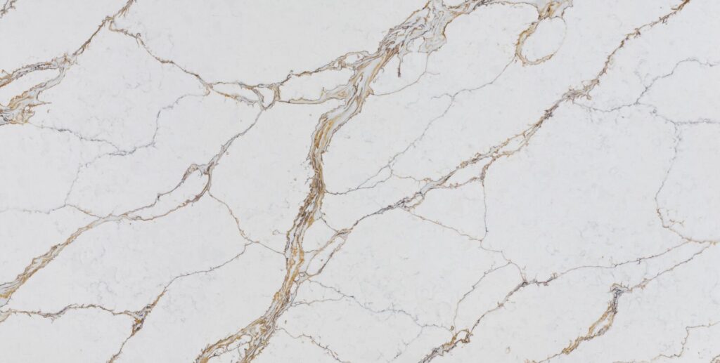 Bold white surface enriched with gold and grey veining
