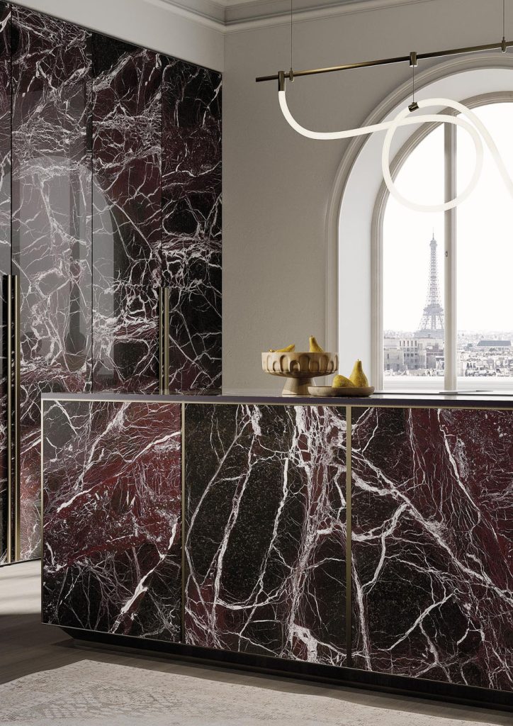 Bold crimson surface with delicate fossil-like patterns, balancing vibrance and heritage.