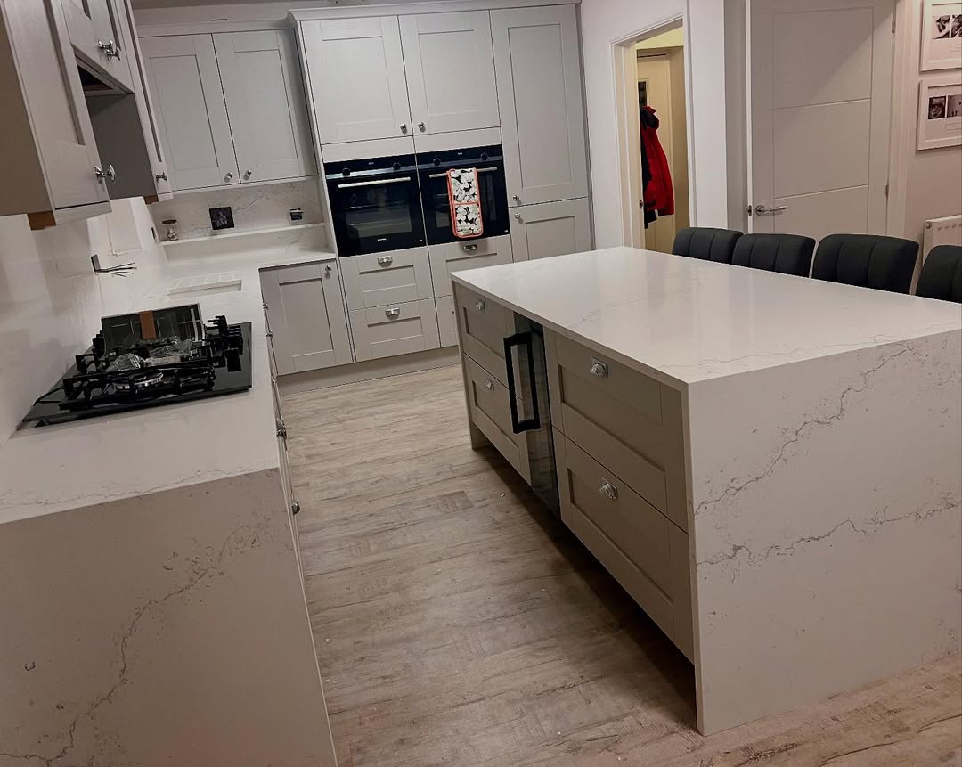Fine-grained white quartz compound stone with grey veins spread over the surface